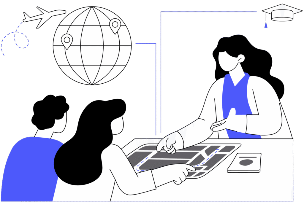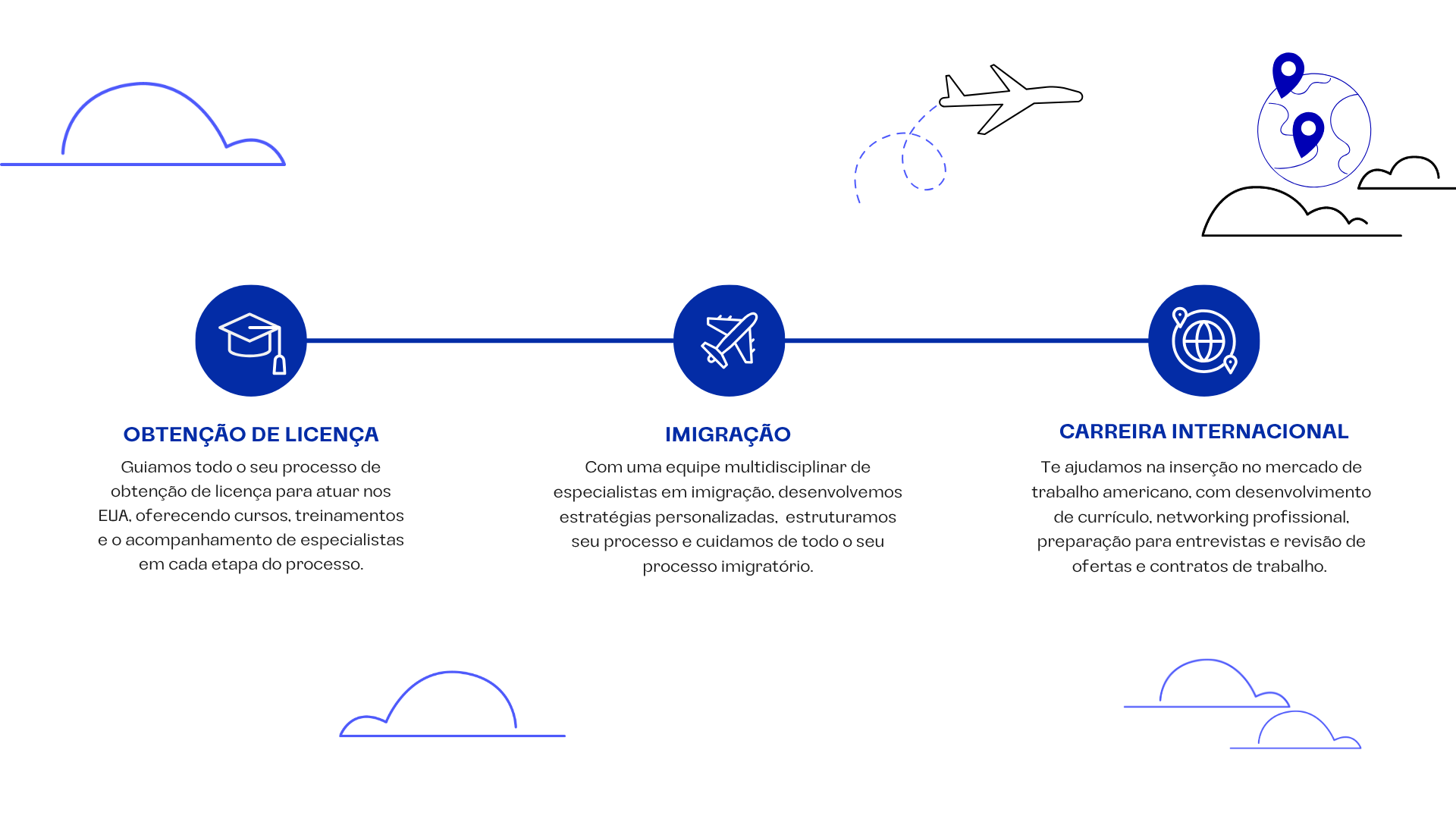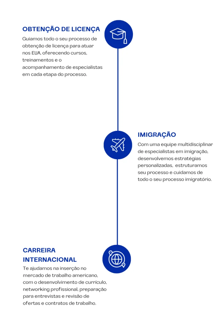 Fale com um especialistaPara realizar uma transição profissional completa, trabalhamos com três grandes momentos: revalidação de diploma e integração profissional, imigração e gestão de carreira. Acompanhamos nossos clientes no passo a passo em todos os momentos, ajudando-os a obter a revalidação de seu diploma, sua licença profissional, um visto adequado e sua colocação no mercado norte-americano.