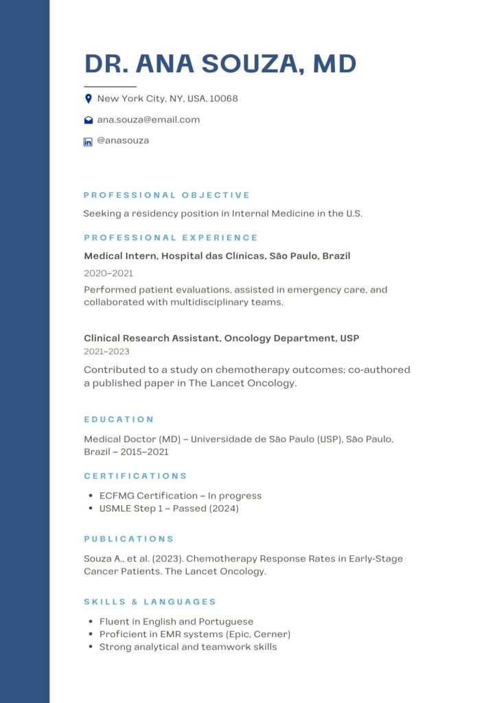 - Objetivo profissional (Professional Objective): uma breve frase que indique sua meta, por exemplo: “Seeking a residency position in Internal Medicine in the U.S.”