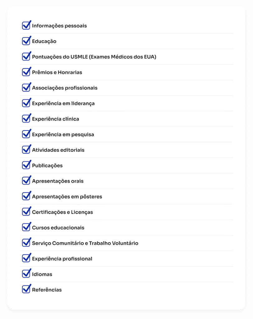 Dica: se ainda não tem experiência no mercado americano, mencione atividades de observação clínica (observership), estágios voluntários ou participação em congressos.